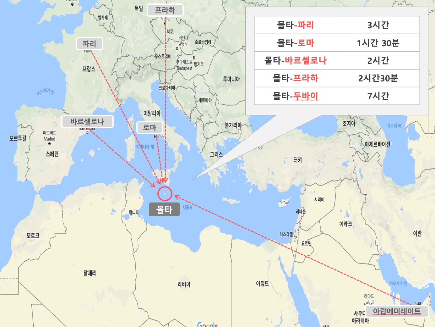대부분의 유럽에서 몰타공화국으로의 비행시간은 약 2~3시간 정도 소요됩니다. 그러나 이는 항공사, 출발지, 날씨 등에 따라 달라질 수 있으므로 정확한 비행시간은 항공편 예약 시 확인하는 것이 좋습니다.