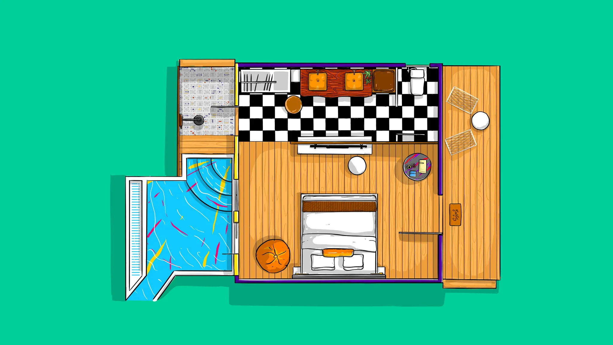 소비 바 스트림: 수영장을 통해 'veyo' 정원 개울로 수영하고, 소비 바의 수영장으로 바로 연결됩니다. 도중에 칼리드와 시티의 손으로 그린 묘사를 찾아 보세요!