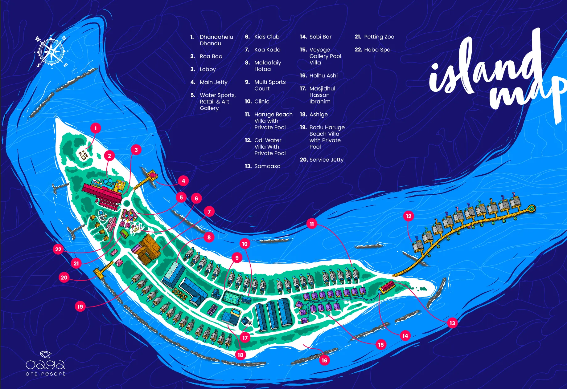 Oaga Art Resort은 몰디브의 아름다운 자연경관과 수중환경을 갖춘 이 곳은 국제공항에서 수상 비행기를 이용하여 약 45분 정도 거리에 위치한 곳으로, 놀라운 자연 경관과 아름다운 해변이 어우러진 아름다운 지역입니다.