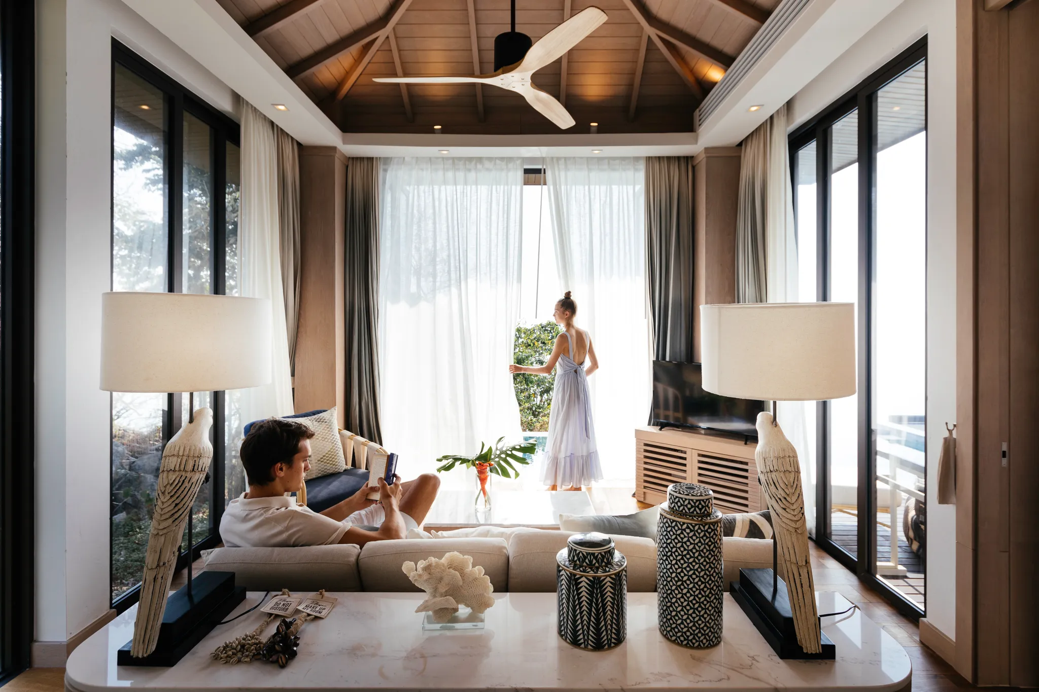 침실에서는 180도 파노라믹 뷰를 즐길 수 있을뿐만 아니라 통유리 형태로 되어진 창 마저도 폴딩 도어로 구성되어 있어 언제든 창을 접어 시원한 바닷 바람을 맞을 수 있게 되어 있기에 만족도는 배가 된다 할 수 있습니다