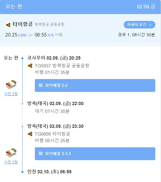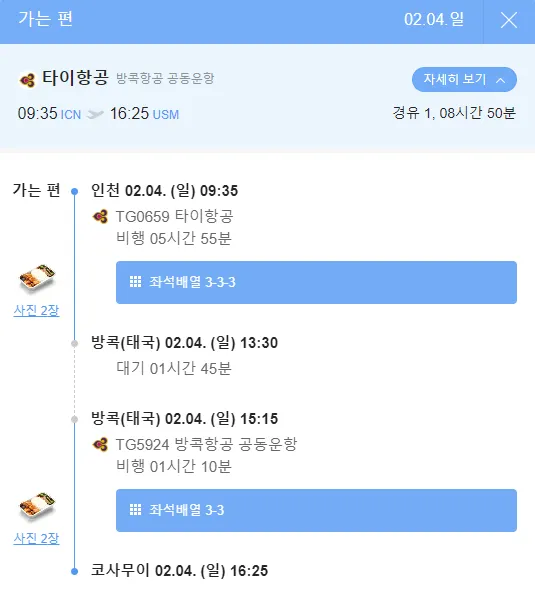 9월3일 오전 09:30 출발 기준 5박7일 항공 스케쥴 /1인 항공료 1,261,300원 (타이항공기준)/(대한항공기준) 1인 1,319,101원