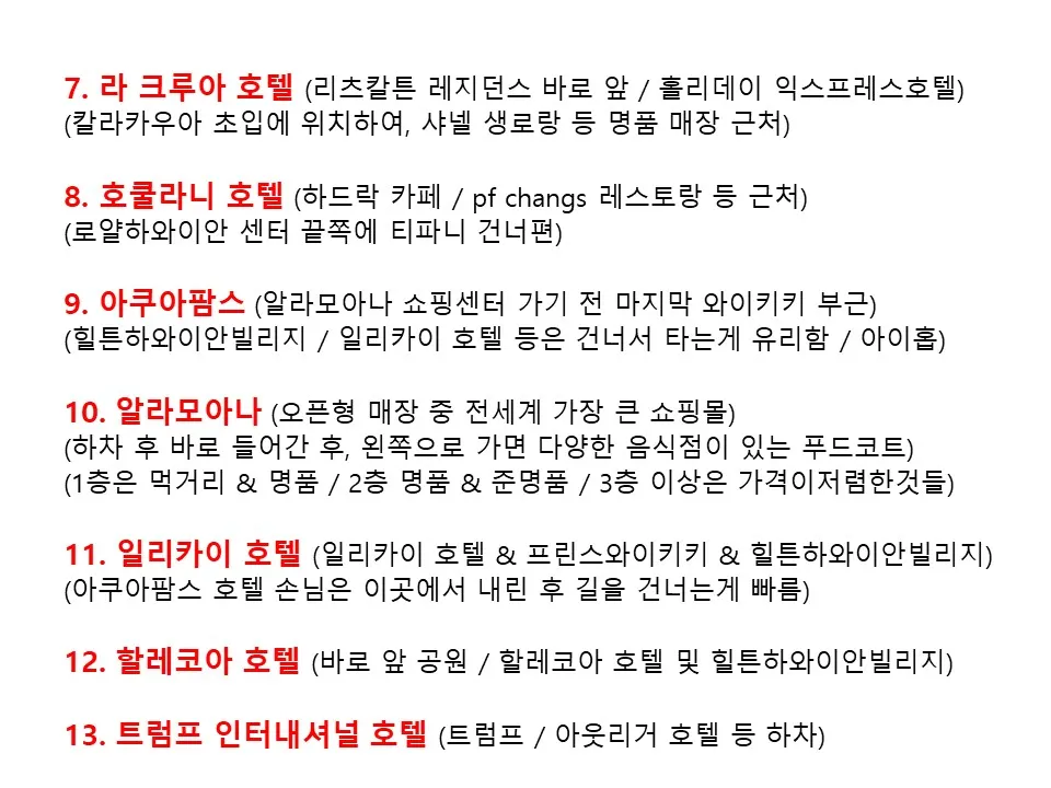 코트야드 메리어트 -> 호텔 라크루아 -> 호쿨라니 호텔 -> 아쿠아 팜스 와이키키 -> 알라 모아나 센터 -헤일코아(힐튼 하와이안)