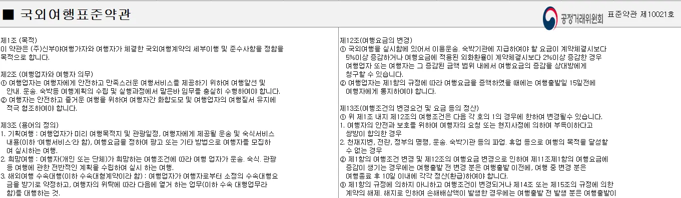 다음과 같이 국외여행표준약관은 공정거래위원회의 표준약관을 준수합니다. (공정거래위원회에서 다운로드 )