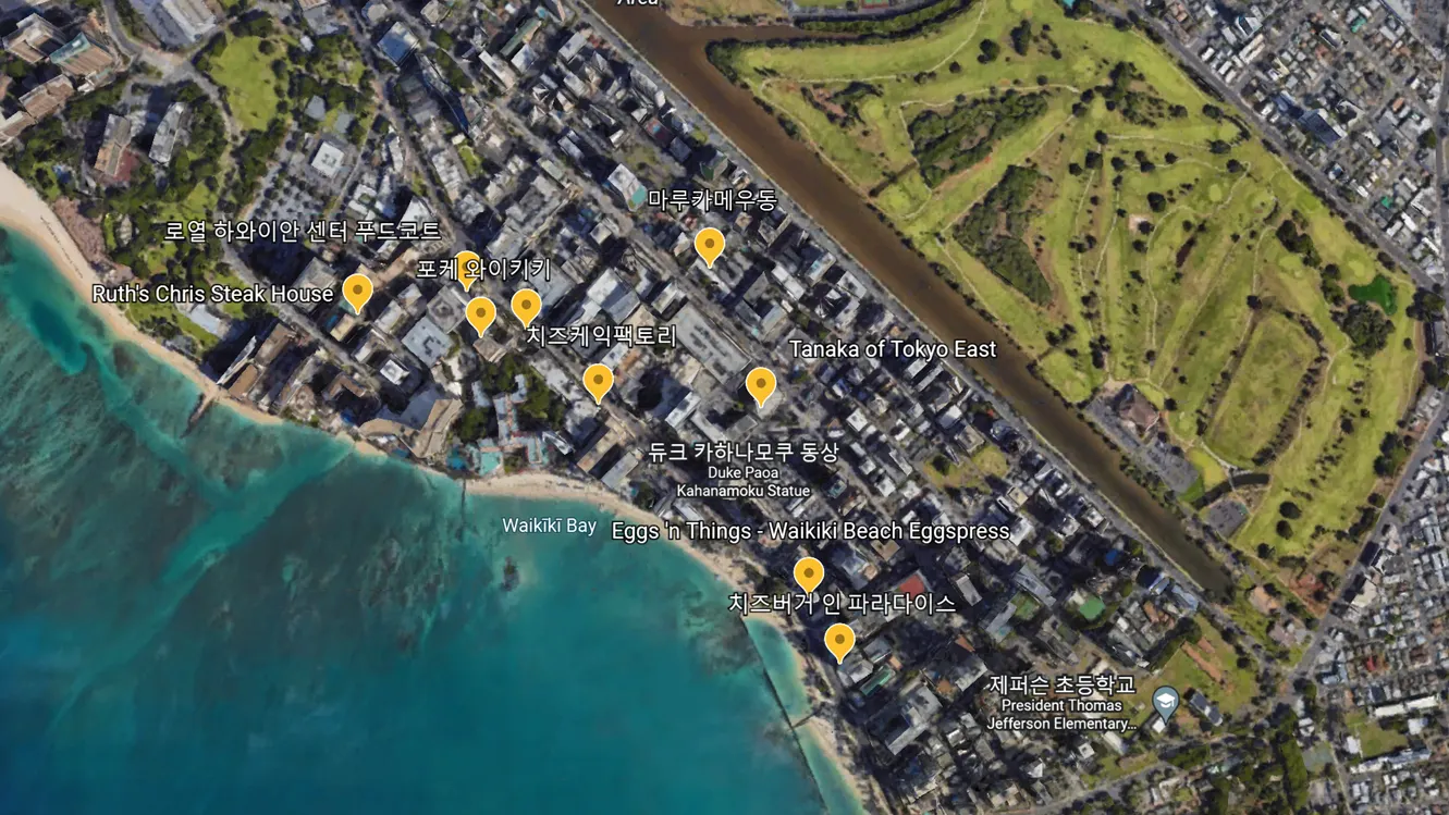 와이키키 쇼핑 플라자 -> 카하나모쿠 공작 동상 -> 트윈핀( 구 아스톤와이키키) -> 힐튼 와이키키 비치 호텔 -> 마루가메 우동