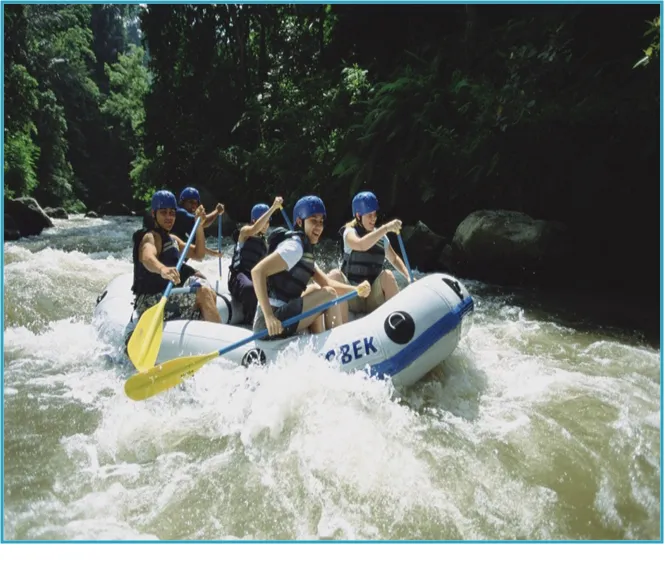 래프팅(Rafting) : 보트에 타고 빠른 속도로 흐르는 강을 내려가는 스포츠입니다. 보트에는 여러 명이 함께 타며, 강의 세기에 따라 다양한 난이도로 구분됩니다. 안전장비를 착용하고 전문가의 안내를 받아 진행됩니다.