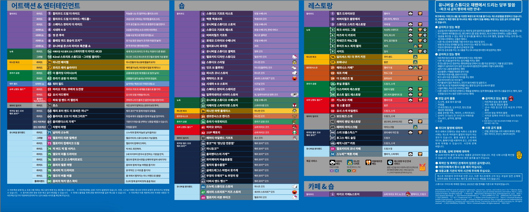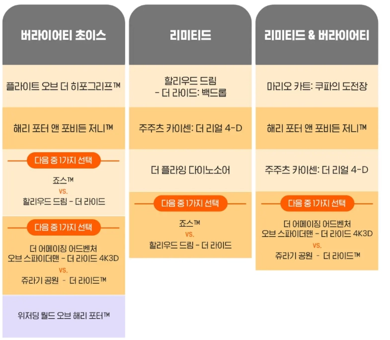 ※ 이용가능 어트랙션에서 선택1, 선택2 등이 있는 경우, 그 중 1개의 어트랙션만 이용할 수 있습니다.