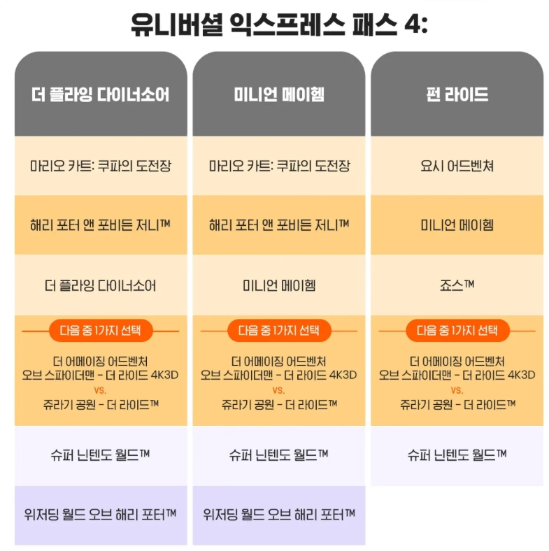 더 플라잉 다이너소어, 해리포터 앤드 더 포비든 저니, 미니언 메이헴 등 인기 어트랙션이 포함된 다양한 익스프레스 패스 종류가 있습니다.