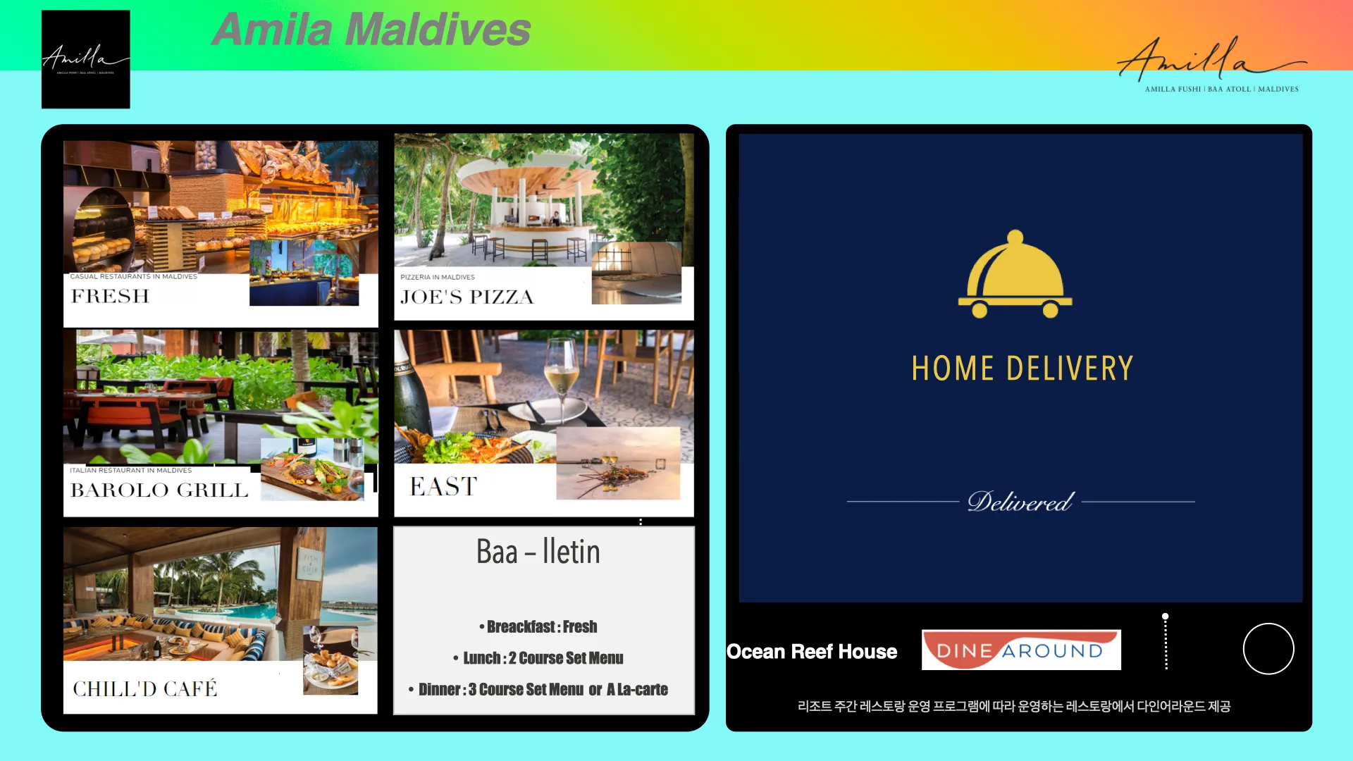 • 조식 : IRU RESTAURANT에서 뷔페식 제공 • 중식 : 아래 레스토랑 중에서 이용 가능 - THE TRIO : 이탈리안 클래식 레스토랑 (3코스 메뉴 제공) - ISLANDER'S GRILL : 해산물 및 바비큐 레스토랑 (3코스 메뉴 제공) - FLUID : 라이트 스낵 (피자, 햄버거, 샌드위치 등) 제공 - REFLECTIONS : 라이트 스낵 (피자, 햄버거, 샌드위치 등) 제공 • 석식 : 아래 레스토랑 중에서 이용 가능 (Iru 레스토랑을 제외한 나머지 레스토랑은 3코스 메뉴 제공) - IRU RESTAURANT : 인터내셔널 테마 뷔페 레스토랑 - THE TRIO : 이탈리안 클래식 레스토랑 - Flavours : 프랑스식 파인 다이닝 레스토랑 - ISLANDER'S GRILL : 해산물 및 바비큐 레스토랑 - BAMBOO : 아시안 레스토랑 - TASTE OF INDIA : 인도식 레스토랑 • 레스토랑과 바에서 오픈 시간 동안 올인크루시브 메뉴에 포함된 음료 및 주류 제공 - 인터내셔널 와인, 스파클링 와인, 프리미엄 브랜드 스피릿, 식전 주, 맥주, 칵테일, 목테일 등 - 소프트드링크, 물, 스페셜리티 커피, 아이스커피, 럭셔리 티 섹션, 아이스티, 밀크셰이크, 스무디 등 • 매일 LA CREMERIA에서 11:00~19:00 사이 아이스크림 제공 • WATERS EDGE에서 11:00~17:00 사이 올인크루시브 메뉴에 포함된 스낵 무료 제공 • 객실 내 미니바의 와인, 맥주, 소프트드링크, 스틸 워터, 티, 커피, 캡슐 커피 4개 무료 이용 가능 (1일 1회 리필) • 투숙 기간 중 로컬 아일랜드 익스피리언스 트립 또는 선셋 피싱 중에서 진행 가능한 익스커션 1회 제공 • 매일 1시간 스탠드 업 패들 보드 무료 이용 가능 |
