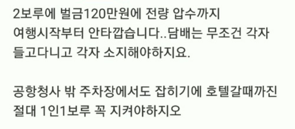 신랑님들은 담배구매건 -> 1인 1보루이상 들고만 있어도 벌금 바로 40만원가량 이니. 주의 꼭 해주세요. 벌금올랐습니다.
